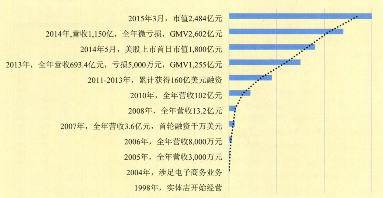 觀(guān)察京東商城,其發(fā)展及表現軌跡主要是:1998年,京東商城的前身實(shí)體店開(kāi)始經(jīng)營(yíng);2004年,開(kāi)始涉足電子商務(wù)業(yè)務(wù);2005~2007年營(yíng)業(yè)收入快速增長(cháng),由3,000萬(wàn)元增長(cháng)至3.6億元,并于2007年獲得首輪千萬(wàn)美元的融資;此后又獲得多筆融資,營(yíng)業(yè)收入呈快速增長(cháng)趨勢,到2014年營(yíng)業(yè)收入增長(cháng)至1,150億元,GMV達到2,602億元,目前仍處于微虧損狀態(tài)。