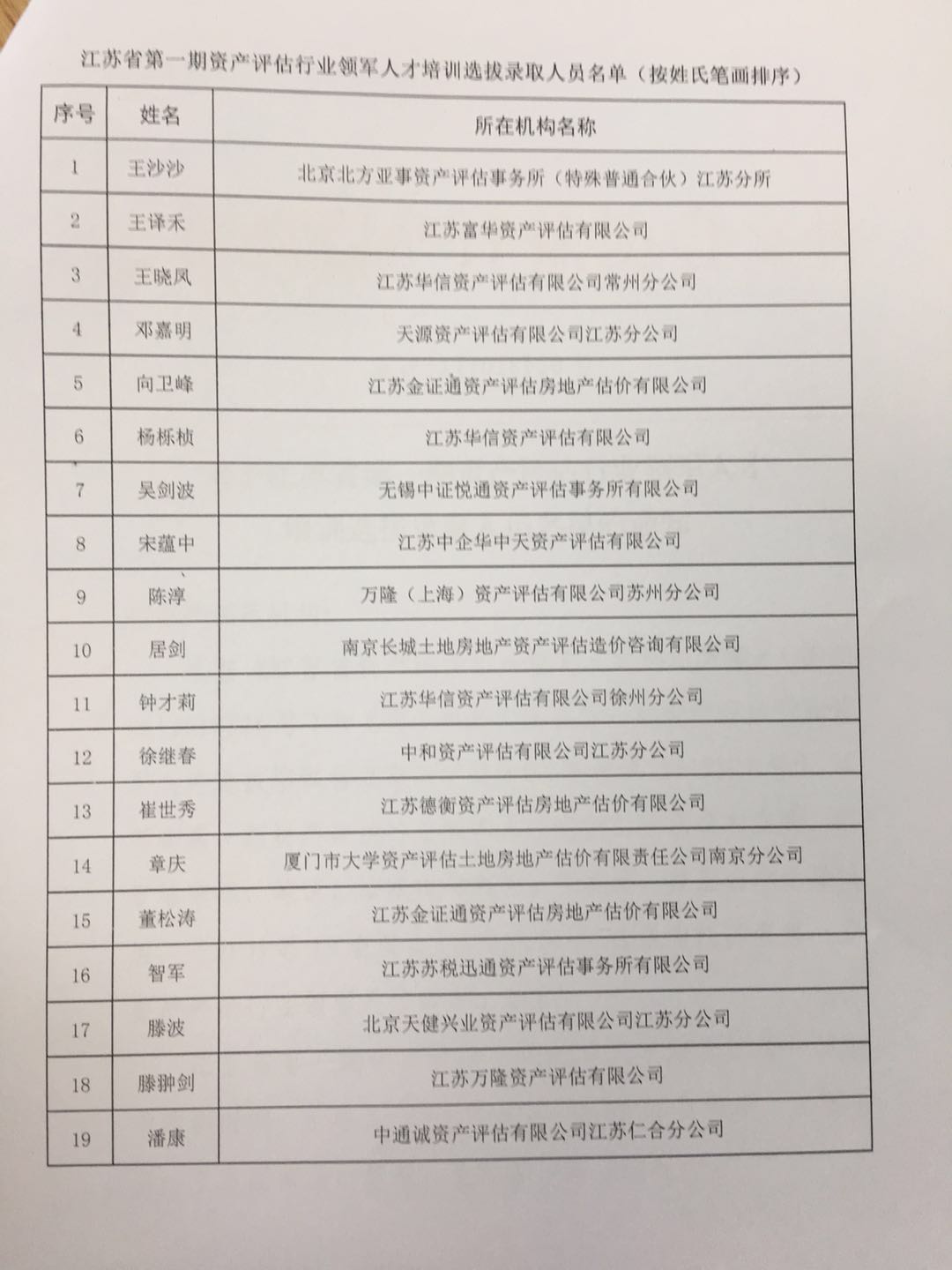 日前,江蘇省資產(chǎn)評估協(xié)會(huì )組織的江蘇省第一期資產(chǎn)評估行業(yè)領(lǐng)軍人才選拔工作順利完成。經(jīng)資格審核、筆試、面試和專(zhuān)家評議等程序,共錄取江蘇省第一批資產(chǎn)評估行業(yè)領(lǐng)軍人才培養對象19名。