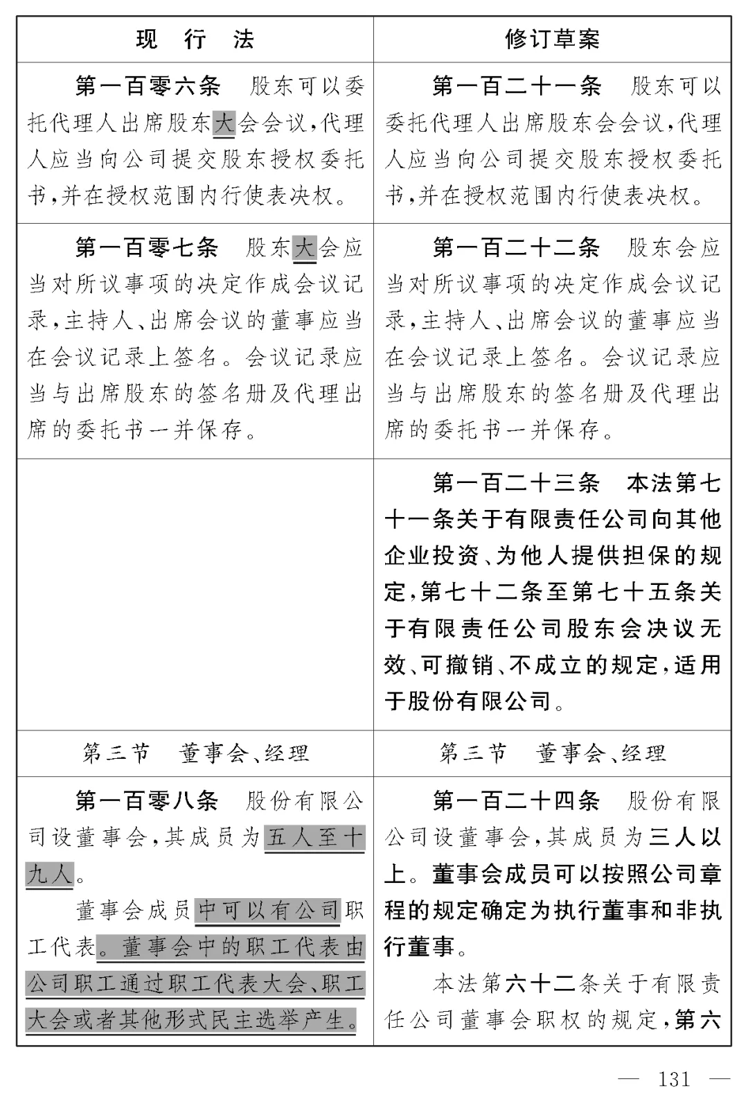 同時(shí),現行公司法在職工董事的設置方面,只對國有獨資和國有全資的有限責任公司提出了要求。為更好保障職工參與公司民主管理、民主監督,修訂草案擴大設置職工董事的公司范圍,并不再按公司所有制類(lèi)型對職工董事的設置提出要求??紤]到修訂草案已規定規模較小的公司不設董事會(huì ),并綜合考慮中型企業(yè)劃分標準等因素,規定:職工人數三百人以上的公司,董事會(huì )成員中應當有職工代表;其他公司董事會(huì )成員中可以有職工代表。(修訂草案第六十三條、第一百二十四條)